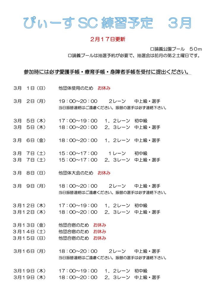ぴぃ〜すSC練習予定3月
