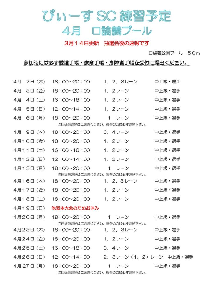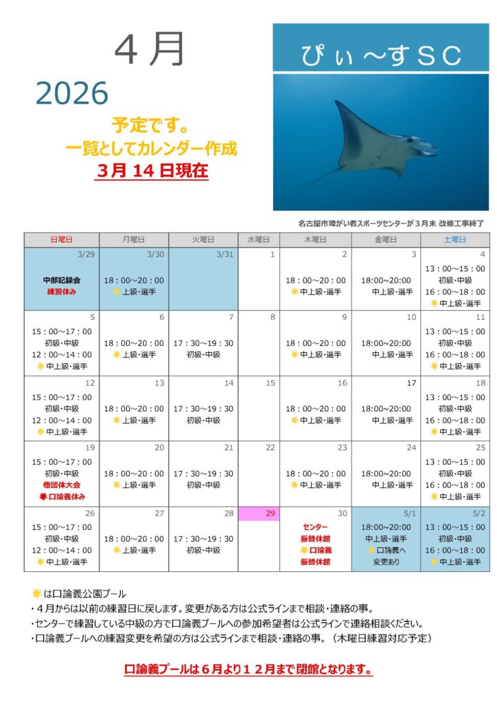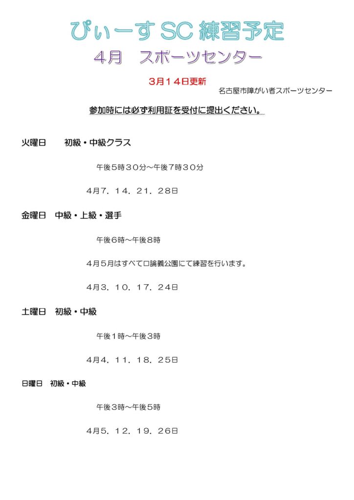 ぴぃ〜すSC練習予定4月